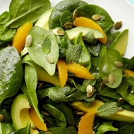 In a salad bowl, combine the spinach leaves (preferably young and tender), mint leaves, avocado, orange segments, and pumpkin seeds.
