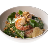 Immediately add the hot shrimp to the sauce. Then, mix the spinach, cilantro leaves, and pomelo flesh with the shrimp and sauce.