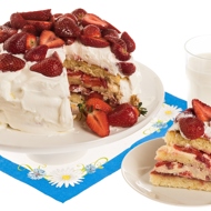 Before serving, whip the cream. Spread it on the sides and top of the cake to your liking. Cut the strawberries in half and arrange them on the surface of the cake.