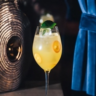 Muddle the kumquat and place it in a shaker. Add the gin, lime juice, yuzu, calamansi puree, and 30 ml of pineapple syrup. Shake all the ingredients together in the shaker.