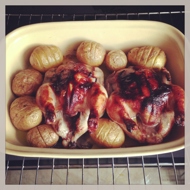 Place the chickens and potatoes in a baking dish or on a baking sheet, and put them in a preheated oven at 356°F. Bake for 40 to 45 minutes.