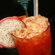 Garnish with a slice of orange and a cocktail cherry on a skewer.