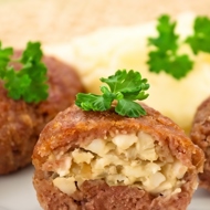 Soak the bread in milk. Mix the ground meat with the bread (squeeze the bread slightly), season with salt and pepper. Shape the mixture into a patty. Place the egg and onion filling in the center of each patty (if the meat is too dry, you can add a small piece of butter). Fold the filling and shape it into a cutlet.