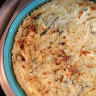 In a bowl, mix 2 cups of rice, grated Gruyère, and 1 egg. Press the mixture into a round baking dish to form a crust. Bake for 5-7 minutes until the edges are lightly browned.