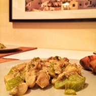 Cut the zucchini into half rings. Heat a large skillet, add a tablespoon of butter, and a splash of olive oil (to prevent the butter from burning). Add the zucchini and cook on low heat under a lid.