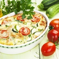 Grease a baking dish with oil, layer the carrot and onion, zucchini, and tomato. Season with salt and pepper, and place in the oven for 15 minutes at 200°C.