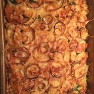 Slice the zucchini into not too thin rings and lay them in an even layer at the bottom of a baking dish.