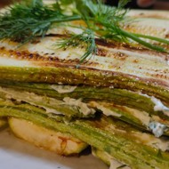 On a serving dish, place the first layer of zucchini and spread the cheese-garlic mixture over them.