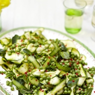 Mix the resulting paste with the zucchini ribbons and green peas.