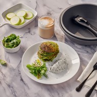 Place the zucchini fritters on a plate and add the sour cream sauce.