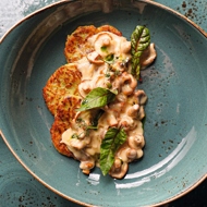 To serve the pancakes, place them on a plate and drizzle with chanterelle sauce.