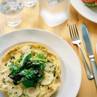 Spread the zucchini over the dough, then add a layer of onion, and sprinkle half of the chopped tarragon. Then top with crumbled cheese.
