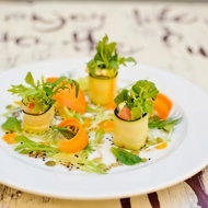 Carefully wrap a piece of salmon, a small spoonful of cream cheese, and leaves of Swiss chard and frisée in a zucchini slice. Gently roll the rolls, as fresh zucchini is very fragile and delicate.