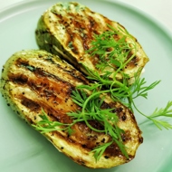 In a grill pan, heat mustard oil and olive oil and place the zucchini slices.
