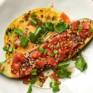 Drizzle the sauce over the zucchini, then sprinkle with seeds and chopped cilantro.