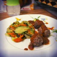 Chop the dill, cilantro, and garlic with a blender, add the tomato paste, and serve with the meatballs.