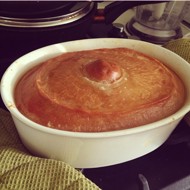 Cover with foil (or a lid), bake for another 40 minutes at 170°C. Pour hot broth through the hole, plug it with a ball, cover again with foil, and bake for 2.5 hours at 150°C. Turn off the oven and let it sit for 30 minutes. Serve by cutting the top dough according to the number of servings, spooning the filling onto plates.